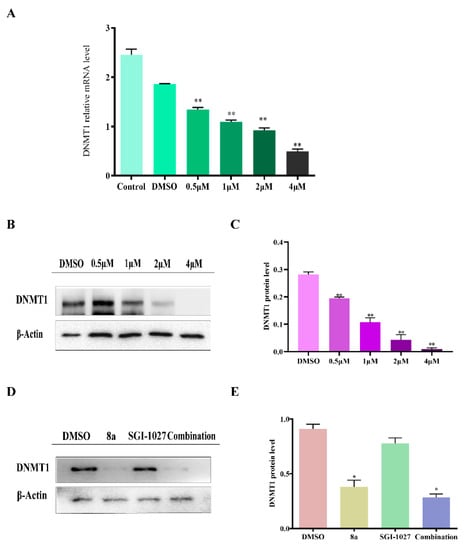 8a affected the expression of DNMT1. (A) RT-PCR was used to analyze the mRNA expression of DNMT1 under different concentrations of 8a (0.5, 1, 2, and 4 μM) in U937 cells (** p < 0.01); 0.1% DMSO can be used to eliminate the interference of compound solvents. (B,C) Western blots analysis of whole-cell extracts from cells treated with 8a (0.5, 1, 2, and 4 μM) for 48 h (** p < 0.01); 0.1% DMSO was used as the control. (D,E) Western blots analysis of U937 cells treated with 8a (2 μM) and SGI-1027 (3 μM) for 48 h. Whole-cell extracts from cells exposed to 0.1% DMSO was used as the control (* p < 0.05, ** p < 0.01).
