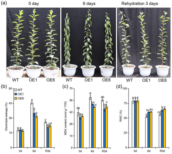 MdATG8i positively regulates drought tolerance. (a) Performance, (b) relative electrolyte leakage, (c) MDA content, and (d) RWC in the leaves of MdATG8iOE plants and WT. The data are presented as means ± SD of three replicates. Values with different letters are significantly different (p < 0.05, Tukey’s multiple range test).