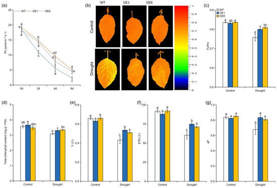 Effect of MdATG8i overexpression in apple on the photosynthetic and chlorophyll fluorescence parameters under drought stress. (a) Photosynthetic rate (Pn), (b) chlorophyll fluorescence images, (c) the maximum quantum yield of PSII (Fv/Fm), (d) total chlorophyll content, (e) the effective quantum yield of PSII [Y(II)], (f) the electron transport rate of PSII [ETR (II)], and (g) photochemical quenching (qP) of WT and MdATG8iOE plants with or without drought stress. The data are presented as means ± SD of three replicates. Values with different letters are significantly different (p < 0.05, Tukey’s multiple range test).