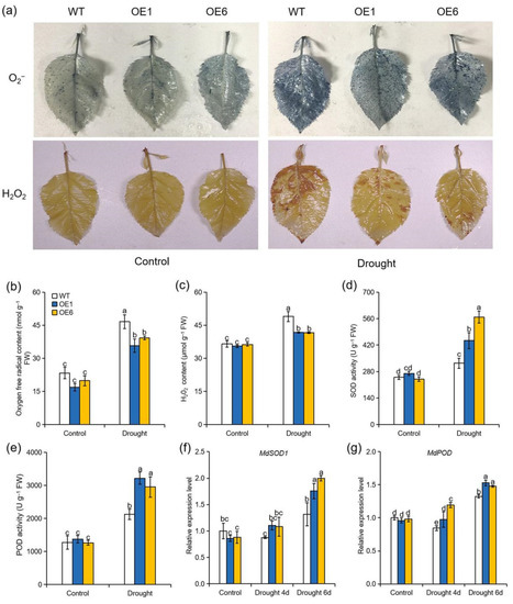 High levels of toxic ROS accumulation under drought stress can result in oxidative stress that ultimately damages cellular components. At the end of the drought treatment, leaves were harvested to be stained using NBT and DAB to examine O2− and H2O2, respectively. The extents of NBT and DAB staining were similar in WT and OE plants under normal conditions. However, all genotypes were stained extensively under drought stress, but denser staining was observed in the WT plants when compared with OE lines (Figure 3a). Consistently, quantitative measurements of O2− and H2O2 contents suggested that the MdATG8iOE lines accumulated fewer ROS compared with WT under severe drought (Figure 3b,c). Besides, the activities of SOD and POD were significantly elevated under drought stress in all genotypes, but greater increases were observed in the OE plants than that in WT (Figure 3d,e). The expression levels of genes encoding SOD1 and POD were elevated more in the OE lines compared with the WT plants under drought stress (Figure 3f,g). These results indicated that overexpression of MdATG8i positively regulated the antioxidant capacity in apple under drought conditions.