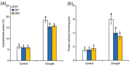 Autophagy functions on degrading damaged proteins and organelles, which are generated under unfavourable environment [20,32,33]. To analyze whether overexpression of MdATG8i influence the accumulation of damaged proteins, we determined the amount of insoluble or oxidized proteins in the WT and MdATG8iOE plants when exposed to drought. As shown in Figure 4a, no significant difference in the amount of insoluble protein as a percentage of the total was observed between WT and transgenic plants under normal conditions. However, the amount of insoluble proteins were approximately 20% and 17% higher in WT than in OE1 and OE6 plants, respectively, at the end of the drought treatment (Figure 4a). Furthermore, carbonyl protein contents were elevated in all genotypes under drought treatment, but the accumulation of oxidized protein was partially alleviated by MdATG8i overexpression (Figure 4b). These results suggested that overexpression of MdATG8i in apple promoted the degradation of oxidized or insoluble proteins under drought stress.