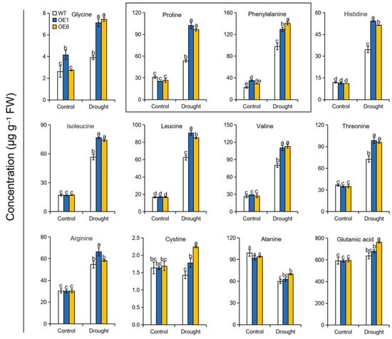 Based on the differences in protein degradation observed above, we next measured the amino acid metabolism of WT and OE plants subjected to drought. As shown in Figure 5, the levels of most measured amino acids were raised in response to drought stress among all genotypes. Furthermore, levels of these responsive amino acids were elevated to a greater extent in the OE lines than in WT plants under drought conditions. For example, the proline concentrations were approximately 2-fold higher in OE lines than in WT plants. In addition, the concentrations of glycine, histidine, and phenylalanine were approximately 1.9, 1.5, and 1.4 times higher in the MdATG8iOE plants than in WT when exposed to drought. These results demonstrated that overexpression of MdATG8i in apple improved amino acid metabolism in response to drought.