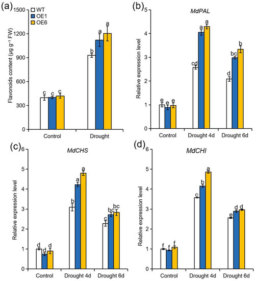 Phenylalanine is the precursor for flavonoid biosynthesis in plants [34]. Due to significant differences in phenylalanine content between OE and WT plants under drought stress, we next measured the levels of flavonoid. Consistent with the trend in phenylalanine content, higher levels of flavonoid were observed in MdATG8iOE lines than in WT after drought treatment (Figure 6a). Phenylalanine ammonia lyase (PAL), chalcone synthase (CHS), and chalcone isomerase (CHI) are common early genes in the pathway of flavonoid synthesis, and we therefore examined their transcript levels [35]. Transcript levels of MdPAL, MdCHS, and MdCHI were upregulated more in the MdATG8iOE lines than these in the WT plants when exposed to drought (Figure 6b–d). Therefore, overexpression of MdATG8i in apple might contribute to enhancing the synthesis of flavonoid under drought stress.