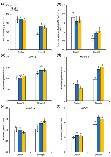 Roots are the key to solving many problems associated with drought stress, as they play a crucial role in the modulation of water status of plant. Root vitality is a widely used physiological indicator that represents the overall activity of the root system and root hydraulic conductivity reflects the capacity for water uptake and transport by roots [36]. Root hydraulic conductivity and root vitality were therefore measured to determine whether MdATG8i influences the modulation of root water uptake under drought stress. Under normal conditions, there were no significant differences in root hydraulic conductivity and root vitality among the genotypes. However, both parameters declined sharply under drought treatment in all genotypes. Nonetheless, the root hydraulic conductivity and root vitality of WT plants were significantly lower than those of the OE lines after 4 d of drought treatment (Figure 7a,b). Plasma membrane intrinsic proteins (PIPs) are members of aquaporin, which function on regulating water transport across membranes [37]. Consistent with the higher root water uptake in the OE lines in response to drought, the expression levels of MdPIP1;2, MdPIP1;3, MdPIP1;4, and MdPIP2;1 were higher in the OE lines than these in the WT plants under drought conditions (Figure 7c–f). These results demonstrated that MdATG8iOE plants maintained better root water absorption capacity under drought conditions.