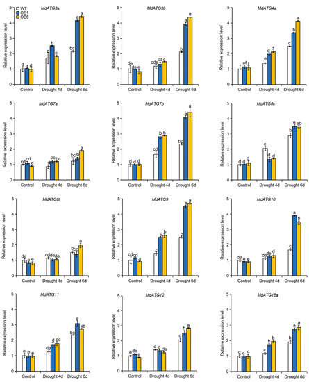 Change in the expression levels of several core apple autophagy-related genes (MdATGs) in the leaves of the WT and transgenic plants following drought treatment. The data are presented as means ± SD of three replicates. Values with different letters are significantly different (p < 0.05, Tukey’s multiple range test).