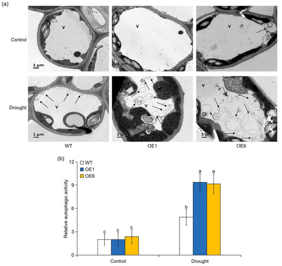 To investigate autophagic activity under drought stress, we measured the transcript levels of 12 core autophagy genes. As shown in Figure 8, the expression levels of these ATG genes were similar in OE lines and WT plants under normal growth conditions. Drought induced the expression of almost all the ATG genes in all genotypes, but their expression levels were significantly higher in the OE plants than in the WT plants (Figure 8). To further confirm the differences in drought-induced autophagy among the genotypes, transmission electron microscopy (TEM) was used to detect autophagic activity. Under normal conditions, only a few autophagic structures were observed in all genotypes (Figure 9a,b). However, the number of autophagic structures increased by nearly 2.5-fold in the WT plants and by 3.9- to 4.6-fold in the OE1 and OE6 lines after 6 d of drought treatment (Figure 9a,b). These results indicated that overexpression of MdATG8i enhanced the occurrence of autophagy in apple when subjected to drought stress.