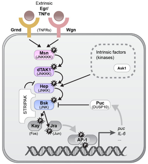 The Drosophila core JNK pathway culminates in the JNK kinase (called Hemipterous (Hep)) phosphorylating and activating one JNK (termed Basket (Bsk)) (Figure 1). The JNK pathway can be activated by the tumor necrosis factor TNF-superfamily ligand Eiger (Egr/TNFα) (reviewed in [3]), which activates two TNF receptors (TNFRs) Wengen (Wgn) [4] and Grindelwald (Grnd) [5]. Egr appears to activate JNK exclusively, while mammalian TNFα also activates NF-κB and MAPK pathways [3]. Downstream of TNFRs, Bsk/JNK phosphorylates AP-1 components Jun and Fos, which are represented by single orthologs in Drosophila, Jun-related antigen (Jra) and Kayak (Kay), respectively, as well as other substrates (reviewed in [6]). AP-1 transcriptionally upregulates numerous target genes. One well-established target gene is puckered (puc) (ortholog of dual-specificity phosphatase 10 (DUSP10) [7], encoding a phosphatase that dephosphorylates Bsk/JNK in an induced-negative feedback loop. Other targets include unpaired (upd), encoding the Drosophila interleukin-6 (IL-6) homolog, and Matrix metalloprotease 1 (Mmp1), encoding a protease that degrades the extracellular matrix (reviewed in [8]). In addition to Puc, JNK signaling is downregulated by the STRIPAK complex components Striatin interacting protein (Strip) and Connector of kinase to AP-1 (Cka), which bind to and inactivate Hep/JNKK [9,10,11]. JNK signaling can also be activated intrinsically, for example, through the redox-sensitive MAPKKK Apoptotic signal-regulating kinase 1 (Ask1) [12].