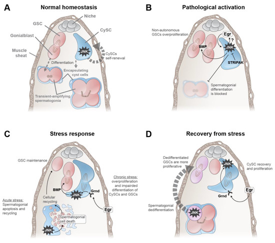 In addition to protein starvation, mating is another JNK-related source of stress in the Drosophila testis [33,35,41]. Prolonged mating (occurring for more than five weeks) in aged flies induces the expression of Egr/TNFα in the muscle sheath, which then accumulates in the testis lumen, and the upregulation of Grnd/TNFR in somatic support cells (Figure 2C). This increased expression of ligand and receptor causes JNK activation in CySCs, inducing excessive proliferation while concomitantly inhibiting somatic differentiation. JNK-activated CySCs also augment Dpp/BMP secretion, which induces the proliferation of early germ cells. However, germline differentiation is abrogated because of improper development of somatic support cells. Both germline and somatic starvation-related phenotypes can be abolished by the somatic downregulation of Grnd/TNFR or Hep/JNKK, or of Egr/TNFα in muscle. In sum, chronic stress reduces fertility in a process similar to an inflammatory response in the muscle sheath [35].