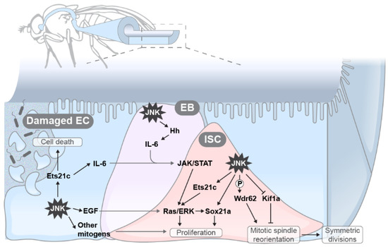 ISC self-renewal and proliferation is controlled by epidermal growth factor receptor (EGFR) and other signaling pathways, whereas ISC differentiation is regulated by Notch and JAK/STAT (reviewed in [54,58,59]). After injury or bacterial infection, JNK is essential for intestinal regeneration. During stress, the JNK pathway is activated in ISCs, EBs, and ECs but serves distinct roles in each cell type (Figure 3). In ECs, activated JNK induces the expression of Ets21c, an ETS-domain transcription factor [60], and Ets21c ensures caspase-dependent death of the damaged cells and induces secretion of growth and inflammatory factors such as EGFs and IL-6 [54,61,62,63]. In EBs, JNK signaling induces IL-6 secretion, but in this cell type IL-6 expression is controlled by the Hh pathway downstream of JNK activation [64]. ISCs receive EGF and IL-6 signals produced by damaged ECs and EBs. These factors activate Ras/MAPK and JAK/STAT pathways, respectively, which promotes ISC proliferation (reviewed in [54,58]). Additionally, JNK is activated in ISCs upon damage to the midgut, but the factors activating JNK in ISCs are not yet known. In ISCs, JNK induces the expression of downstream effectors Ets21c and Sox21a, a Sox transcription factor member [60,65]. Autonomous JNK activation in ISCs synergizes with self-renewal pathways such as Ras/ERK to augment their proliferation (Figure 3) [66,67,68]. JNK can become activated in ISCs and induce ISC proliferation, even in the absence of EC death, by feeding animals with small amounts of opportunistic bacteria [68].
