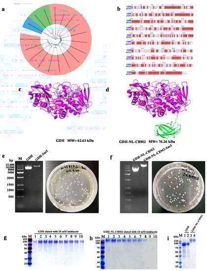 Sequence, phylogenetic, and structural analysis of FAD-GDH from A. niger An76 as well as SDS-PAGE analysis of heterologously expressed FAD-GDH proteins. (a) Phylogenetic analysis of the fFAD-GDHs retrieved from the CAZy database; (b) Sequence alignments of Aspergillus flavus FAD-GDH (AfGDH, PDB ID: 4YNT); (c,d) Predicted structures of wild-type GDH and fusion GDH (GDH-NL-CBM2), respectively; (e,f) Agarose gel electrophoresis analysis of the original and linearized plasmids of pPIC9k-GDH and pPIC9k-GDH-NL-CBM2, respectively; (g) Lane M: protein standard marker, Lanes 1–10: the eluting numerical sequence under the optimal imidazole elution concentrations of GDH and GDH-NL-CBM2, SDS-PAGE of GDH eluted with 20 mM imidazole; (h) SDS-PAGE of GDH-NL-CBM2 eluted with 10 mM imidazole; (i) SDS-PAGE of concentrated GDH and GDH-NL-CBM2, lanes 1 and 2, 3, and 4 were duplicate tests for GDH and GDH-NL-CBM2, respectively.