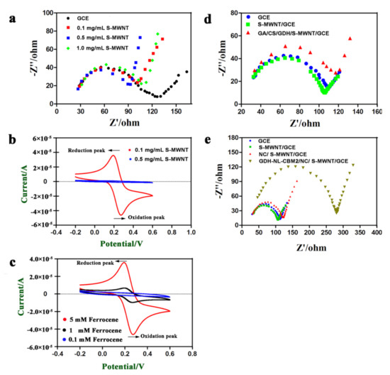 Electrochemical characterization of the electrodes prepared by two different methods. (a) Impedance spectra for bare GCE (black), 0.1 mg/mL S-MWCN/GCE (red), 0.5 mg/mL S-MWCN/GCE (blue), and 1 mg/mL S-MWCN/GCE (green) electrode; (b) CV of GCE modified with 0.1 mg/mL (red) and 0.5 mg/mL (blue) S-MWNT in 5 mmol/L ferrocene (Fc) solution; (c) CV of GCE modified with 0.1 mg/mL S-MWNT in 0.1 mmol/L (blue), 1 mmol/L (black) and 5 mmol/L (red) ferrocene solution; (d) Impedance spectra for bare GCE (blue), S-MWCN/GCE (green), and GA/CS/GDH/S-MWCN/GCE (red); (e) Impedance spectra of bare GCE (blue), S-MWCN/GCE (green), NC/S-MWNT/GCE (red), and GDH-NL-CBM2/NC/S-MWNT/GCE (brown). The measurement of EIS was performed in a 0.1 M KCl solution containing 10 mM K3 [Fe(CN)6] and K4 [Fe(CN)6] as the electrochemical probe solution. The arrows in b and c indicated the scanning direction.