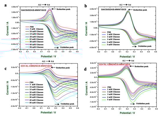 Cyclic voltammetry (CV) measurements of the GA/CS/GDH/S-MWCN/GCE and GDH-NL-CBM2/NC/S-MWNT/GCE responding to different concentrations of glucose. (a) CV measurements of GA/CS/GDH/S-MWCN/GCE responding to high concentrations of glucose (5, 10, 15, 20, 25, 30, 40, and 50 mM) dissolved in PBS (0.1 M citric acid/0.2 M Na2HPO4 buffer, pH 6.0, with 5 mM ferrocenylmethanol); (b) CV measurements of GA/CS/GDH/S-MWCN/GCE responding to low concentrations of glucose (1, 2, 3, 4, and 5 mM) dissolved in PBS (0.1 M citric acid/0.2 M Na2HPO4 buffer, pH 6.0, with 5 mM ferrocenylmethanol); (c) CV measurements of GDH-NL-CBM2/NC/S-MWNT/GCE responding to high concentrations of glucose (5, 10, 15, 20, 25, 30, 40, and 50 mM) dissolved in PBS (0.1 M citric acid/0.2 M Na2HPO4 buffer, pH 6.0,with 5 mM ferrocenylmethanol); (d) CV measurements of GDH-NL-CBM2/NC/S-MWNT/GCE responding to low concentrations of glucose (1, 2, 3, 4, and 5 mM) dissolved in PBS (0.1 M citric acid/0.2 M Na2HPO4 buffer, pH 6.0, with 5 mM ferrocenylmethanol). The arrows indicated the scanning direction.