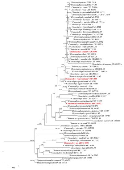 - Abreu, L.M.; Moreira, G.M.; Ferreira, D.; Rodrigues-Filho, E.; Pfenning, L.H. Diversity of Clonostachys species assessed by molecular phylogenetics and MALDI-TOF mass spectrometry. Fungal Biol. 2014, 118, 1004–1012. [Google Scholar] [CrossRef] [PubMed]