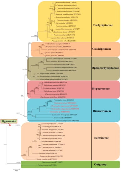 - Wang, Y.B.; Wang, Y.; Fan, Q.; Duan, D.E.; Zhang, G.D.; Dai, R.Q.; Dai, Y.D.; Zeng, W.B.; Chen, Z.H.; Li, D.D.; et al. Multigene phylogeny of the family cordycipitaceae (hypocreales): New taxa and the new systematic position of the chinese cordycipitoid fungus paecilomyces hepiali. Fungal Divers. 2020, 103, 1–46. [Google Scholar] [CrossRef]