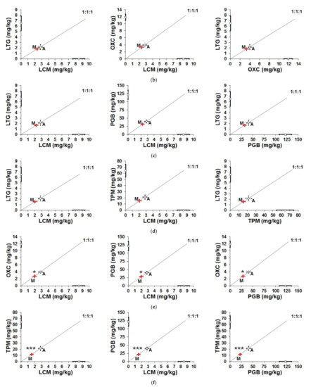 - Luszczki, J.J.; Andres, M.M.; Czuczwar, P.; Cioczek-Czuczwar, A.; Wojcik-Cwikla, J.; Ratnaraj, N.; Patsalos, P.N.; Czuczwar, S.J. Levetiracetam selectively potentiates the acute neurotoxic effects of topiramate and carbamazepine in the rotarod test in mice. Eur. Neuropsychopharmacol. 2005, 15, 609–616. [Google Scholar] [CrossRef]