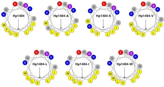 The analog peptides were designed by substituting amino acids in Hp1404. The three-dimensional structures of Hp1404 and its analog peptides were constructed using Mobyle@RPBS (http://mobyle.rpbs.univ-paris-diderot.fr/cgi-bin/portal.py#welcome accessed on 14 August 2020). Helical wheel diagrams and the hydrophobicity of the peptides were obtained using the HeliQuest site (http://heliquest.ipmc.cnrs.fr, accessed on 14 August 2020).