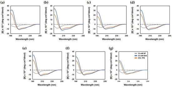Circular dichroism spectra of Hp1404 and its analog peptides. The secondary structure of peptides was measured in 10 mM SP buffer, 50% TFE and 30 mM SDS by CD spectrometry. (a) Hp1404, (b) Hp1404-A, (c) Hp1404-K, (d) Hp1404-V, (e) Hp1404-L (f) Hp1404-I and (g) Hp1404-W peptide concentration was fixed at 40 μM.