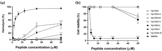 We evaluated the hemolytic activity of the peptides against mouse erythrocytes. All peptides with amino acid substitutions showed lower hemolysis than Hp1404 (Figure 3a). At the highest tested concentration of 50 μM, Hp1404, Hp1404-L and Hp1404-W showed hemolytic activities of 49.2%, 45.8% and 15.9%, respectively. However, Hp1404-A, Hp1404-K and Hp1404-V showed no hemolytic activity. The parent peptide Hp1404 showed hemolytic activity of 41.7%, similar to the rate at 50 μM, whereas Hp1404-L, Hp1404-I and Hp1404-W induced 21.3%, 0% and 1.7% hemolysis at 25 μM. Melittin, used as a positive control, showed 42% hemolytic activity at concentrations up to 1.56 μM, indicating that it is toxic.