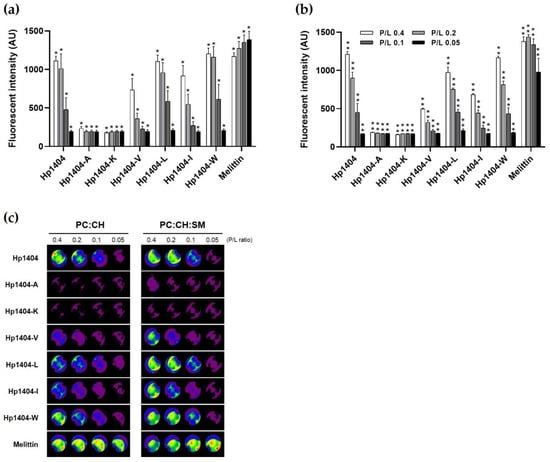 As shown in Figure 4a,b, to evaluate the toxicity of the peptides via their effects on the cell membranes, large unilamellar vesicles (LUVs) containing calcein were used in a leakage assay. Upon treatment with various concentrations of peptides at LUVs, calcein was released in a concentration-dependent manner. For Hp1404-A and Hp1404-K, phosphatidylcholine: cholesterol (PC:CH) liposomes (mimicking human erythrocyte membrane) and PC:CH: sphingomyelin (SM) liposomes (mimicking mammalian cell membrane) did not release calcein, indicating no toxicity. Following treatment with melittin, which was used as a positive control, regardless of the concentration, the fluorescence intensity of calcein was released up to 1500 arbitrary units (a.u.). Hp1404-V, Hp1404-I, Hp1404-L and Hp1404-W caused similar calcein leakage as the parent peptide Hp1404 and was less toxic than melittin. Furthermore, calcein leakage was assessed using a fluorescence-labeled organism bioimaging instrument. As shown in Figure 4c, the analog peptides (Hp1404-V, Hp1404-I, Hp1404-L and Hp1404-W) caused lower leakage activity in liposomes compared to the positive control melittin and parent peptide Hp1404, and no fluorescence was observed for Hp1404-A and Hp1404-K. Based on these results, the analog peptides are not highly toxic towards mammalian cell membranes.