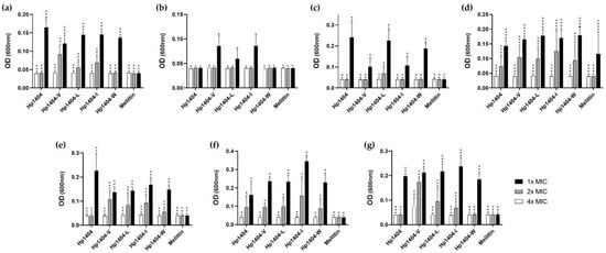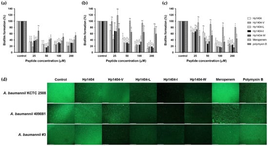 We performed a crystal violet staining assay to evaluate the biofilm reduction ability of the peptides and antibiotics (Figure 8a–c). In A. baumannii KCTC 2508, Hp1404, Hp1404-V, Hp1404-L, Hp1404-I and Hp1404-W showed reduced biofilm activity at 50 μM, with reductions of 74.06%, 79.50%, 84.72%, 83.82% and 79.90%, respectively. Hp1404 and its analog peptides (Hp1404-V, Hp1404-L, Hp1404-I and Hp1404-W) reduced biofilm formation by up to 80% in the baumannii #3 at 100, 50, 50, 50 and 50 μM, respectively. For A. baumannii 409081, Hp1404, Hp1404-V, Hp1404-L, Hp1404-I and Hp1404-W peptides of 50 μM reduced biofilm formation by 34.52%, 53.23%, 64.76%, 72.68% and 65.08%, respectively. All analog peptides removed the biofilm at a lower concentration compared to Hp1404. Polymyxin B showed lower MIC values than the peptides and strong biofilm inhibition effects, but the ability to remove formed biofilm was low.
