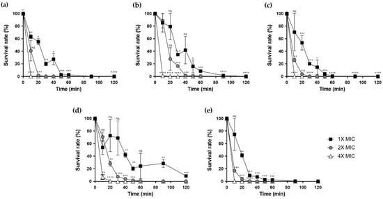 Time-killing assay. Peptides were prepared at concentrations of 1×, 2× and 4× MIC and treated against A. baumannii KCTC 2508. (a) Hp1404, (b) Hp1404-V, (c) Hp1404-L, (d) Hp1404-I and (e) Hp1404-W. Data are presented as the mean ± SEM of three independent experiments. * p < 0.05, ** p < 0.01, *** p < 0.001, **** p < 0.0001 versus the control group. ns = Not statistically significant.