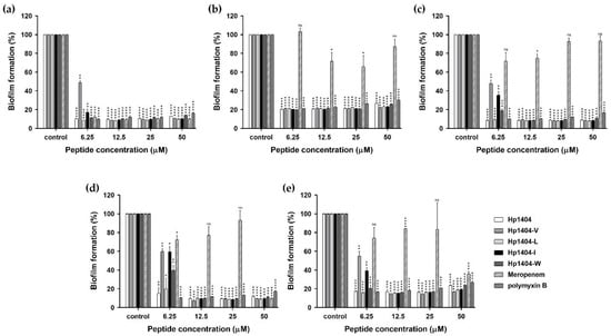 We quantified biofilm formation in a crystal violet staining assay. The absorbance values of the standard strain and six clinically isolated strains were measured, and the highest formation rate of the four strains was used to confirm biofilm inhibition ability. As shown in Figure 7a, Hp1404 and its 4 analog peptides (Hp1404-V, Hp1404-L, Hp1404-I and Hp1404-W) inhibited A. baumannii KCTC 2508 biofilm formation at 6.25, 12.5, 6.25, 6.25 and 6.25 μM, respectively. The antibiotics meropenem and polymyxin B also inhibited biofilm formation at 6.25 μM. For A. baumannii #3 and 409081, Hp1404 inhibited biofilm formation at 6.25 μM and its 4 analog peptides inhibited this formation at 12.5 μM. Meropenem did not affect biofilm inhibition at less than 25 μM, and polymyxin B showed inhibition at 6.25 μM (Figure 7b,d). In A. baumannii #4, Hp1404, Hp1404-V, Hp1404-L, Hp1404-I and Hp1404-W inhibited biofilm formation at 6.25, 12.5, 6.25, 12.5 and 12.5 μM, respectively. Additionally, Hp1404, Hp1404-V, Hp1404-L, Hp1404-I, and Hp1404-W showed biofilm inhibition effects at 6.25, 12.5, 6.25, 12.5 and 12.5 μM, respectively, in A. baumannii 719705. Similarly, for A. baumannii #3 and 719705, meropenem exhibited no biofilm inhibition activity and polymyxin B showed activity at 6.25 μM (Figure 7c,e).