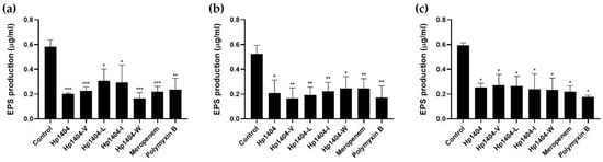 Effect of Hp1404 and its analog peptides on biofilm reduction and EPS production in A. baumannii strains. (a) A. baumannii KCTC 2508, (b) A. baumannii #3 and (c) A. baumannii 409081. Data are presented as the mean ± SEM of three independent experiments. * p < 0.05, ** p < 0.01, *** p < 0.001 versus the control group.