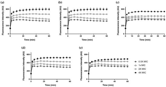 Outer membrane permeabilization of A. baumannii KCTC 2508 determined in NPN uptake assay. The increase of fluorescence intensity measured for 30 min at excitation wavelength of 350 nm and emission wavelength of 420 nm. (a) Hp1404, (b) Hp1404-V, (c) Hp1404-L (d) Hp1404-I and (e) Hp1404-W. Data are presented as the mean ± SEM of three independent experiments.