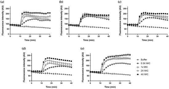 The inner membrane depolarization in the presence of peptides was determined using a membrane potential-dependent probe, DisC3-5. Briefly, mid-log phase A. baumannii KCTC 2508 cells were washed three times with 5 mM HEPES buffer (pH 7.3) containing 20 mM glucose. Next, 100 µL bacterial suspension (OD600 = 0.05) and 50 μL of a final concentration 1 μM DisC3-5 (in 5 mM HEPES with 20 mM glucose and 0.1 M KCl) mixtures were added to 96-well black microplates and incubated for 60 min until dye uptake reached a maximum. The peptides (0.5×, 1×, 2× and 4× MIC of peptides) were treated at 50 μL, and the change in fluorescence intensity was monitored for 30 min at excitation and emission wavelengths of 622 and 670 nm, respectively [56].