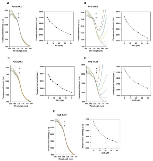 The fluorescence quenching of hAK1 in the presence of (A) atorvastatin, (B) fluvastatin, (C) pravastatin, (D) rosuvastatin and (E) simvastatin at 37 °C. (left) Emission spectra of hAK1 in the presence of statin, (right) dependence of fluorescence intensity on statin concentration. The concentration of hAK1 was 2 μM. The concentrations of the five statins from a to h were 0, 2, 4, 8, 16, 24, 32 and 40 μM, respectively.
