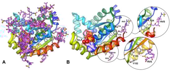 Results of blind docking of RVS to hAK1 performed with the SwissDock server. (A) All predicted binding sites for RVS (pink sticks) in hAK1. (B) The conformation of RVS at the selected possible binding regions in close vicinity of tyrosine residues. Ap5A is shown as spheres; possible hydrogen bonds are marked in red dashed line.