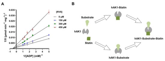 (A) Double reciprocal plots of hAK1 inhibition by rosuvastatin (RVS). (B) A graphical presentation of hAK1 noncompetitive inhibition by statins.