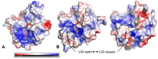 Electrostatic potential mapped on the solvent-accessible surface of (A) hAK1 (PDB ID: 1Z83) in the closed state and (B) AKst in the open (PDB ID: 1ZIN) and closed (PDB ID: 4QBH) state. Cofactor Ap5A is shown in sticks representation. Electrostatic potential was calculated using APBS plugin 2.1 to PyMOL.