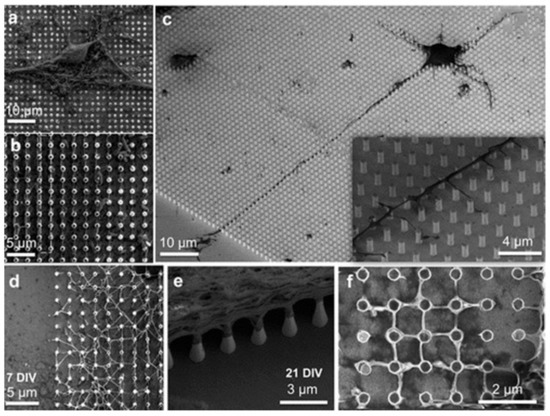 SEM images of the growth of neurons and neurites on nanowire arrays. (a) A cell body from hippocampal culture on the nanowire array, top view, after 20 DIV. (b) Another area on the same substrate as in panel (a), where neurites can be seen to grow along the nanowires, top view. (c) A neuron from cortical culture after 2 DIV. The inset depicts a closer view around the axon. (d,e) Cellular network on the edge of the nanowire array after 7 and 21 DIV, respectively. (f) Neurite growth on an area of nanowires after 5 DIV showing anchoring and secondary branching of neurites at the nanowires. Adapted with permission from Ref. [17]. Copyright (2017) American Chemical Society.