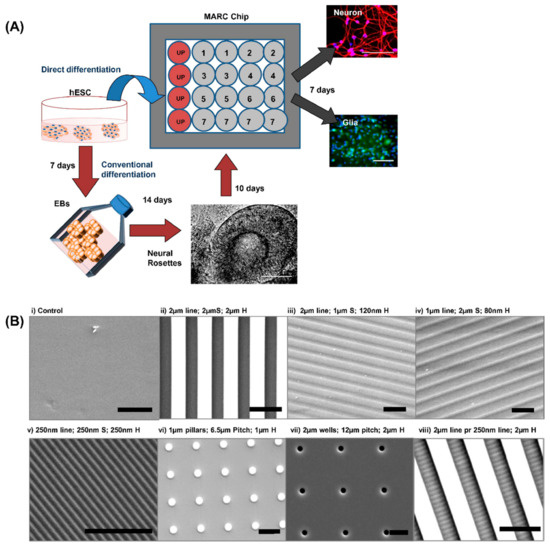 (A) A schematic of human embryonic stem cell (hESC) neural differentiation into neurons and glial cells on the multi-architecture chip (MARC) with minimal neuronal supplements by the direct or conventional method. In “direct differentiation” (blue arrow), the hESCs were seeded directly on the MARC and analyzed for neural markers after 7 days. In “conventional methods” (red arrows) of differentiation, hESCs were grown as embryoid bodies and neurospheres before seeding onto the MARC. On the MARC, each pattern is represented by a circle and has a duplicate. The red circles represent the unpatterned control surface. Scale bar: 100 μm. (B) (i–viii) Patterns are replicated with high fidelity on polydimethylsiloxane (PDMS) as verified by scanning electron microscopy (SEM) images. The geometries are transferred onto PDMS from the MARC master molds by soft lithography. (i) Unpatterned PDMS control, (ii) 2 μm grating with 2 μm spacing and 2 μm height, (iii) 2 μm grating with 1 μm spacing and 120 nm height, (iv) 1 μm grating with 2 μm spacing and 80 nm height, (v) 250 nm grating with 250 nm spacing and 250 nm height, (vi) 1 μm pillar with 6.5 μm pitch and 1 μm height, (vii) 2 μm wells with 12 μm pitch and 2 μm height, (viii) hierarchical structure having 250 nm gratings with 250 nm space perpendicular to the 2 μm grating. The spacing and height between the 2 μm gratings is also 2 μm. Scale bars: 5 μm. Abbreviations: “S” refers to the spacing between the gratings, “H” refers to the height of the topography and “perpendicular to” is abbreviated as “pr.” Adapted with permission from Ref. [33].