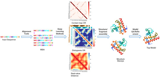 In this article, we will highlight the recent developments in the application of Deep Learning for 3D protein structure prediction with a focus on various steps of the protein structure prediction pipeline. For template-free structure prediction approaches, the important steps are as follows: (i) identification of sequence homologs and generation of multiple sequence alignment, (ii) residue–residue contact prediction and/or residue–distance prediction, (iii) iterative fragment assembly simulations guided by potential or ab initio 3D modeling driven by contacts/distances, and (iv) atomic-level structure refinement and ranking or Quality Assessment of models [22,25] as shown in Figure 1. Although there is a little variation in steps in these prediction protocols, most successful protein structure prediction pipelines such as I-TASSER [26] are hybrid (combination of template-based structure prediction and template-free structure prediction); Rosetta [27] and RaptorX [28] can be thought of as having these important common steps.