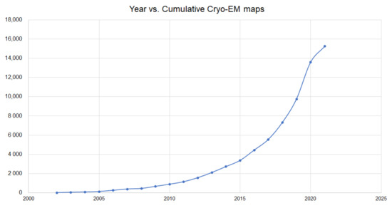 In addition, recent advances in microscopy as well as algorithms for image processing have helped Cryo-EM become one of the most widely used techniques for the determination of protein structures and complexes. Figure 2 shows the cumulative number of electron maps released in Electron Microscopy Data Bank (EMDB) [29]. Although the number of these maps has significantly increased, there is an intermediate computational step that is required to obtain molecular structures from these Cryo-EM maps. There have been some remarkable DL-based advances for Cryo-EM-based protein structure prediction.