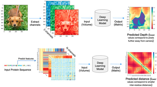 The protein inter-residue distance prediction is the prediction of a pairwise distance matrix (2D) from a protein sequence (1D amino acid sequence). It can be compared with the monocular or stereo depth estimation problem in computer vision as shown in Figure 3. In image depth prediction, an image matrix is provided as input and a depth matrix is predicted as an output where each pixel has a predicted depth (distance from the camera to the object). Similar to the depth prediction problem, the distance prediction takes a three-dimensional input volume (height × width × channels) and outputs a distance map with the same dimension as the input (height × width) but with a single channel. However, the input channels in computer vision problems range from one to three, but there are a few to few hundred channels in distance prediction problems depending on the input features. Additionally, the distance map is symmetrical about the diagonal, and each pixel on the map represents a distance between a pair of residues in the sequence.