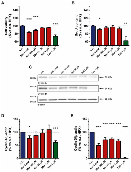 Effect of melatonin on cell viability and proliferation. (A) The bars show the effect of melatonin (1 mM, 100 µM, 10 µM or 1 µM) on the viability of PSCs incubated under hypoxia (in %: 86.77 ± 1.15; 94.16 ± 1.41; 97.38 ± 1.39; 98.39 ± 2.11; respectively for each concentration of melatonin vs. nontreated cells under hypoxia, which was considered 100%). Tps (1 µM) was used as control for cell death (in %: 63.67 ± 2.21). (B) The bars show the effect of melatonin on BrdU incorporation to DNA of dividing cells (in %: 90.88 ± 3.50; 95.36 ± 2.84; 97.19 ± 4.42; 92.81 ± 4.52; 62.38 ± 10.25; respectively for 1 mM, 100 µM, 10 µM or 1 µM melatonin and 1 µM Tps). (C) The figure shows representative blots of the expression of cyclin A and cyclin D, which were evaluated by Western blotting with specific antibodies. The band corresponding to each protein is marked by an arrow. The molecular weight of each specific protein is given on the right side of each blot. To ensure equal loading of proteins, the levels of β-actin were employed as controls under the tested conditions. (D,E) The bars show the quantification of protein levels for cyclin A (76.13 ± 10.01; 87.20 ± 13.91; 96.71 ± 13.01; 109.7 ± 17.56; 60.68 ± 6.79; respectively for 1 mM, 100 µM, 10 µM or 1 µM melatonin and 1 µM Tps) and cyclin D (49.69 ± 7.24; 70.57 ± 8.50; 73.90 ± 4.23; 66.61 ± 6.83; 1.79 ± 1.80; respectively for 1 mM, 100 µM, 10 µM or 1 µM melatonin and 1 µM Tps). Values show the mean ± SEM of normalized values expressed as % vs. nontreated cells (incubated under hypoxia and in the absence of melatonin or Tps), which was considered 100%. In the graphs, a horizontal dashed line represents the value achieved in nontreated cells. Data are representative of three to four independent experiments (n.s., nontreated cells; HPX, hypoxia; Mel, melatonin; Tps, thapsigargin; *, p < 0.05; **, p < 0.01; and ***, p < 0.001 vs. nontreated cells).