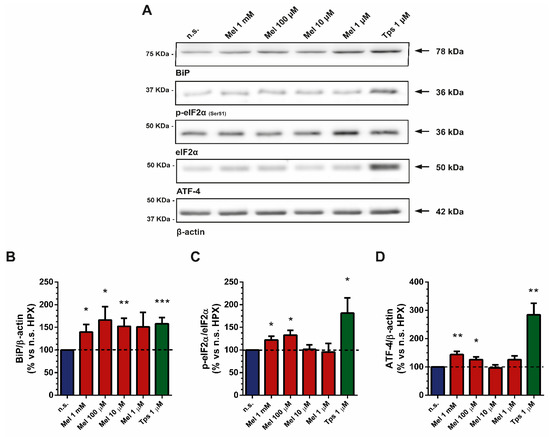 Next, we investigated whether ER stress is involved in the responses of PSCs to melatonin treatment under hypoxia. For this purpose, cells were incubated under hypoxia and in the presence of melatonin (1 mM, 100 µM, 10 µM or 1 µM) for 4 h. Under these conditions, we detected an increase in the level of BiP (Figure 2A,B), in the phosphorylation of eukaryotic initiation factor 2 (eIF2α; Figure 2A,C) and in the level of ATF-4 (Figure 2A,D) in comparison with the levels noted in cells incubated in hypoxia but in the absence of melatonin. Treatment of cells with Tps (1 µM), an ER stress inducer [29] (Figure 4A,B), induced increases in the levels of the three proteins studied (Figure 2A–D).