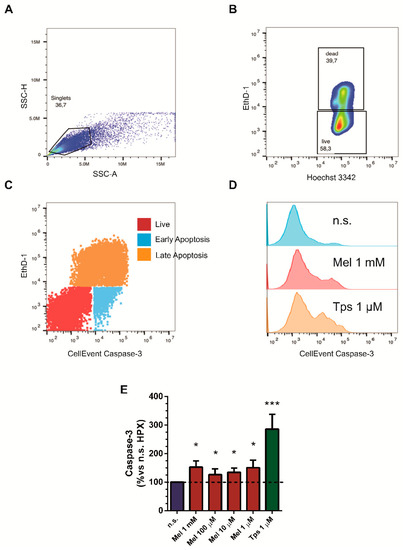 Study of caspase-3 activation in PSCs subjected to melatonin treatment under hypoxia. Cells were incubated for 24 h under hypoxia in the absence (nontreated) or in the presence of different concentrations of melatonin (1 mM, 100 µM, 10 µM or 1 µM) or with thapsigargin (Tps; 1 µM). (A) Doublets and clumps are identified and gated out to restrict the analysis to single cells. (B) 2D plot showing live and dead cells after staining with Eth-1 (dead) and Hoechst 3342 (live). (C) 2D dot plot showing apoptotic cells after staining with CellEvent and Eth-1. (D) The effect of the treatment is depicted, showing increased expression of caspase-3 from top to bottom. (E) The bars show the quantification of caspase-3 activation (152.80 ± 21.80; 126.40 ± 20.00; 134.40 ± 14.90; 150.70 ± 26.40; 285.90 ± 52.00; respectively for 1 mM, 100 µM, 10 µM or 1 µM melatonin and 1 µM Tps) in comparison with that detected in cells incubated in the absence of melatonin (nontreated cells), which was considered 100%. Tps (1 µM) was used as control. In the graph, a horizontal dashed line represents the level noted in nontreated cells (incubated under hypoxia and in the absence of melatonin or Tps), which was considered 100%. Results are representative of three different preparations (n.s., nontreated cells; HPX, hypoxia; Mel, melatonin; Tps, thapsigargin; *, p < 0.05; ***, p < 0.001 vs. nontreated cells).