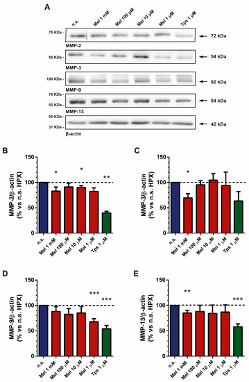 PSCs were incubated for 4 h under hypoxia and in the presence of melatonin (1 mM, 100 µM, 10 µM or 1 µM). Separate batches of cells were incubated in the absence of melatonin but under hypoxia (nontreated cells). In general, treatment of cells with melatonin decreased the expression of MMPs, in comparison with the levels detected in nontreated cells (Figure 6). Tps (1 µM) also decreased the expression of MMPs (Figure 6).