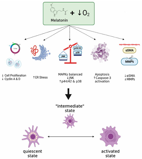 Summary of the effects of melatonin on PSCs subjected to hypoxia. PSCs exhibit increased proliferation under hypoxia. Thus, proliferating PSCs might contribute to the growth of abnormal tissue within a damaged pancreas, allowing the growth of malignant cells included in the mass. Melatonin may exert a certain level of ER stress and a proapoptotic action that could lead to a certain degree of cell death. In addition, melatonin could influence the cell cycle, thereby slowing down the proliferation of surviving cells. Major members of the MAPK family could be involved. Additionally, a decrease in the release of MMPs and a decrease in the expression of α-sma were also observed in cells treated with melatonin. Melatonin might therefore control the viability and proliferation of PSCs under hypoxia, leading the cells to a hypothetic “intermediate state”. Hence, melatonin might decrease the fibrotic reaction that could lead to impairment of the pancreatic function and that could contribute to survival and development of transformed epithelia within the pancreas (α-sma, α smooth muscle actin; ER, endoplasmic reticulum; JNK, c-Jun N-terminal kinase; MMP, matrix metalloproteinase). Figure created with BioRender software (BioRender.com).