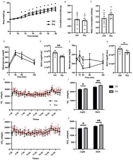 2.1. Erythritol Decreased Obesity and Glucose Intolerance Induced by the HFD