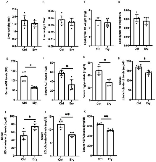 2.4. Erythritol Reduced Levels of Hepatic Enzyme and Serum Lipids Induced by the HFD