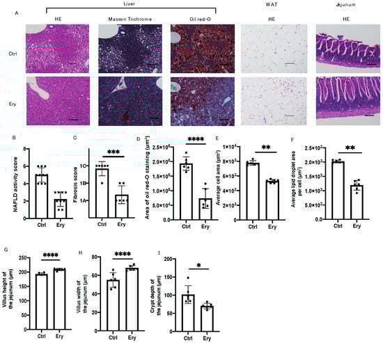 2.5. Erythritol Ameliorated the NAFLD, Increase in Adipocyte Size, and Small Intestinal Inflammation Induced by the HFD
