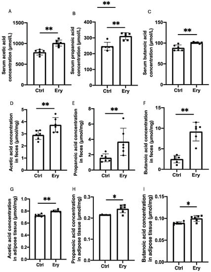 2.6. Erythritol Increased SCFAs in the Serum, Feces, and eWAT