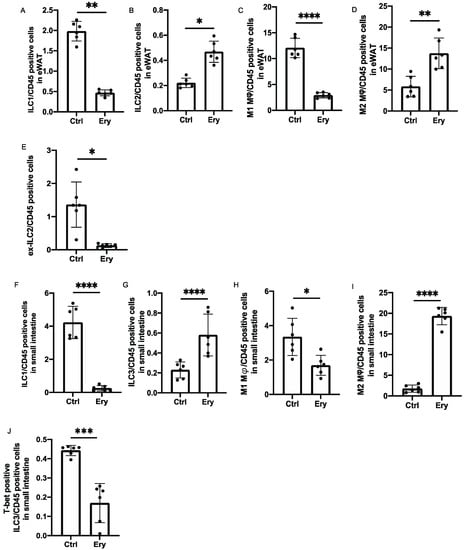 2.7. Erythritol Increased ILC2s in the eWAT and ILC3 in the Lamina Propria of the Small Intestine
