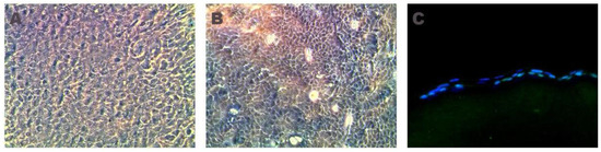Phase-contrast microscopy of autologous (A) or heterologous (B) rabbit LEPCs cultured on a fibrin-PRGF membrane displaying their typical polyhedral morphology. Immunofluorescence analysis of fibrin-PRGF membranes cultured with rabbit LEPCs for p63 in green and DAPI in blue (C). 100× (phase-contrast microscopy) and 400× (immunofluorescence).