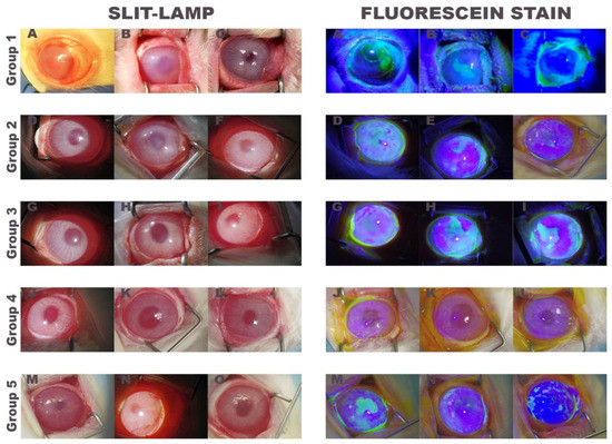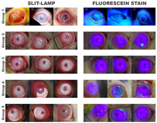 Seven days after the alkali-burn lesion, the ocular surface was photographed and evaluated by slit-lamp (Kowa, Dusseldorf, North Rhine-Westphalia, Germany), and the extent of epithelial damage was assessed by fluorescein stain. Opacification, neovascularization, number of fibrovascular pannus and epithelial defects observed in the photographs were evaluated according to the criteria shown in Table 4 [77,78].